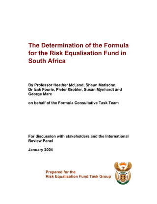 This document summarizes the work of the Formula Consultative Task Team in South Africa to determine an appropriate formula for the country's Risk Equalisation Fund (REF). The REF aims to promote equity and solidarity in South Africa's transition to a social health insurance system with mandatory membership. The Task Team considered evidence and principles for choosing risk factors to include in the REF formula. Key risk factors identified were age, gender, births/first year of life, chronic diseases, and last year of life. The document also discusses defining the scope of benefits to be equalized and guidelines for REF operations and inclusion of different medical scheme types. The goal was to establish a formula that fairly allocates risk across schemes based on member characteristics.