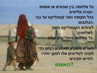 כל מלחמה ביןשבטים או אומות יוצרת פליטים . בכל תקופה נוצר קונפליקט על גבי הגלובוס . לעיתים הקונפליקט הופך למלחמה . כל מלחמה והפליטים שלה . האו " ם משקיע מאמצים רבים כדי לעזור לפליטים אלו למען יחזרו לחיים תקינים . האמנם ?