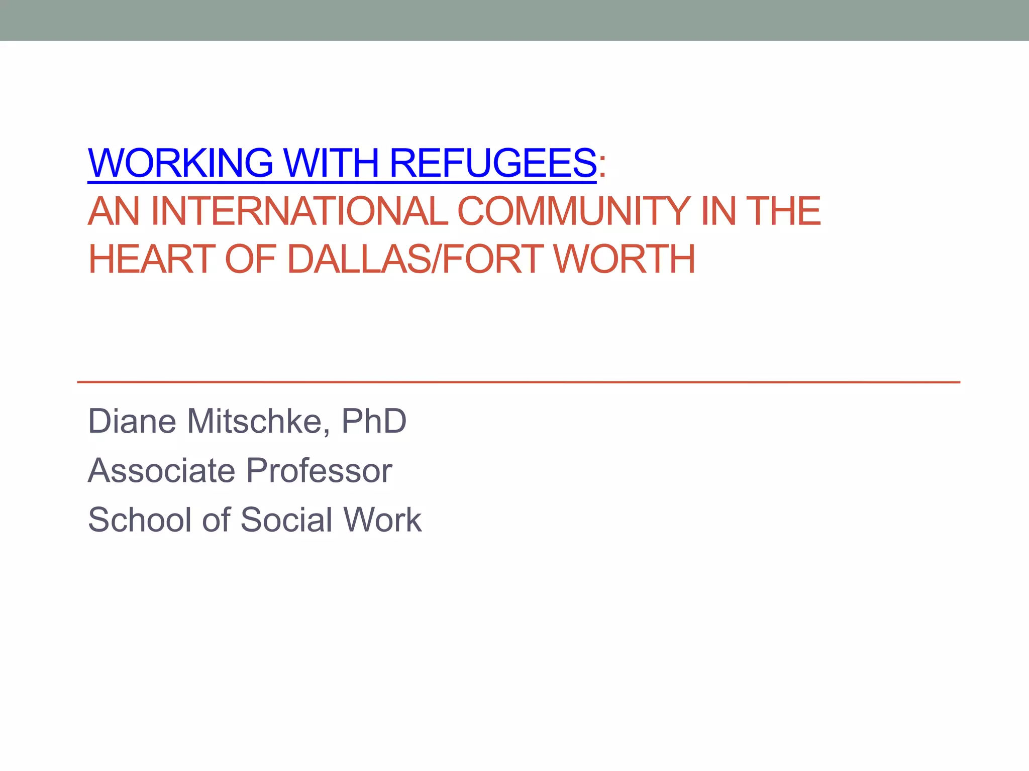 This document provides information about refugees resettling in the Dallas/Fort Worth area. It defines a refugee and notes that over 900,000 refugees were seeking resettlement globally in recent years. The largest refugee populations in the area come from Burma, Bhutan, Iraq, Somalia and Congo. The resettlement process aims to provide a safe living environment, support system, and path to self-sufficiency within 4-8 months. However, refugees often face challenges like poverty, language barriers, employment, health care and violence in their new communities. The document outlines social work opportunities to assist refugees and local resettlement agencies in Dallas and Fort Worth.