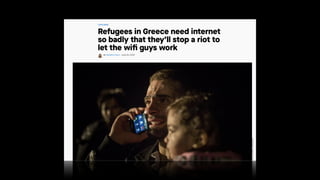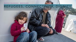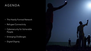 The document discusses the evolution of refugee connectivity and the importance of cybersecurity for vulnerable populations in crisis situations. It highlights the historical deployment of hastily formed networks in response to disasters and the increasing significance of communication technologies for refugees, particularly during the 2015 European migration crisis. It emphasizes the need for digital dignity in humanitarian aid and the protection of personal data while addressing cybersecurity threats faced by humanitarian agencies.