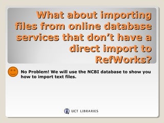 This document provides instructions for importing text files from databases into RefWorks. It uses the NCBI database PubMed as an example. The steps are: conduct a search in PubMed on a topic, like "biological invasions AND marine ecosystems"; select an article and choose "Citation Manager" to create a text file; save the file on your computer; in RefWorks, select "Import" and choose NLM PubMed as the data source and PubMed as the database; browse and select the saved text file; click "Import" to add the reference to RefWorks.