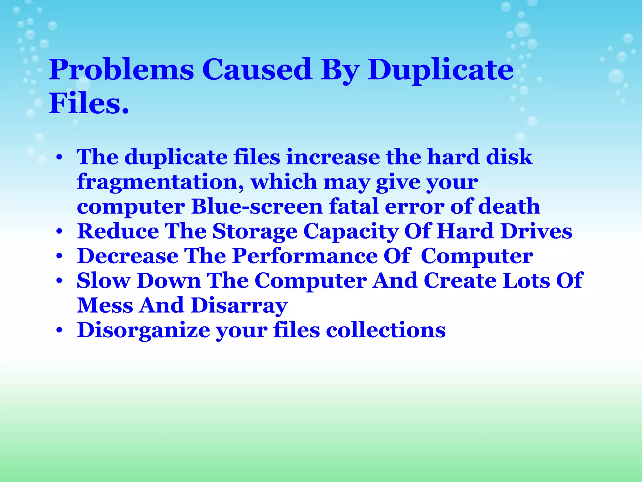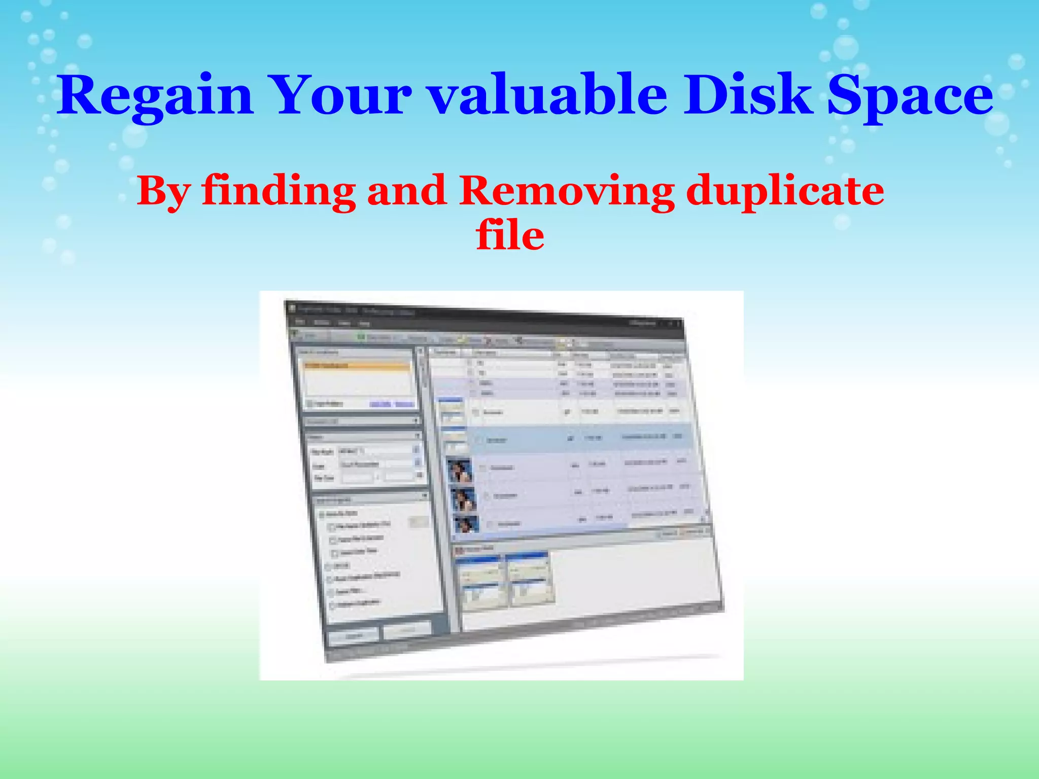 This document provides steps to find and remove duplicate files using a program called Duplicate Finder 2009. It describes how to scan folders and drives to find duplicate files based on criteria like file type, size and date. Once duplicate files are found, they can be previewed, marked and then deleted, moved or renamed to remove duplicates and free up disk space. The duplicate files can fragment disks and reduce performance by decreasing available storage and slowing down computers.