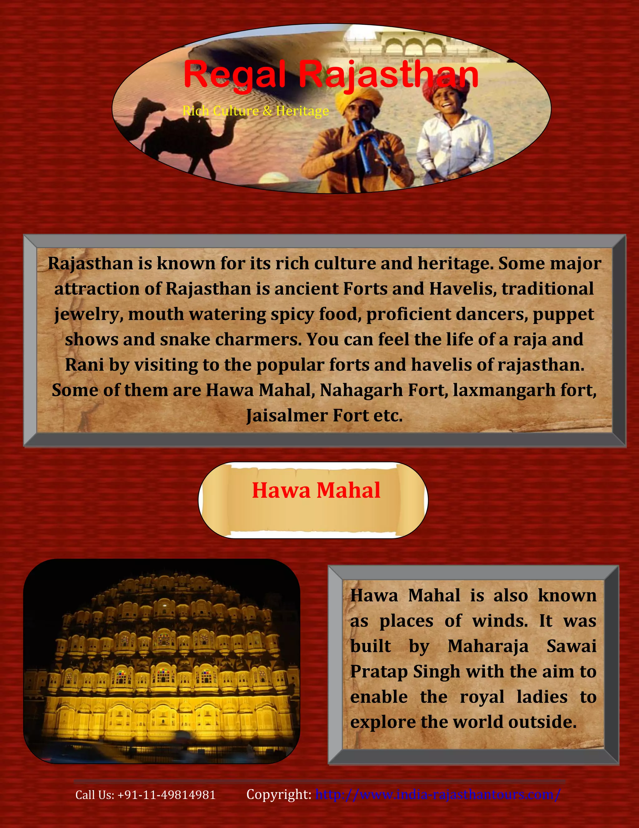 Rajasthan is known for its rich culture and heritage as evidenced by its grand forts and havelis. Some of the major attractions highlighted include Hawa Mahal, Chittorgarh Fort, Amber Fort, Jaisalmer Fort, Bagore ki Haveli, and Nathmalji ki Haveli - all of which showcase Rajasthan's history, architecture, and traditions through their unique designs. The document promotes Rajasthan as a colorful place full of adventure and invites the reader to explore and experience its cultural attractions and way of life.
