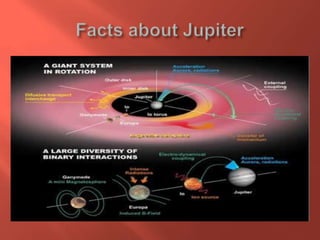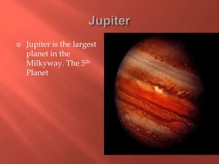 Jupiter is the largest planet in our solar system. It is a giant gas ball with a rocky core that takes approximately 12 years to orbit the sun. Jupiter has over 64 moons, including the largest moon Ganymede, and iconic swirling clouds due to its fast rotation and diverse atmosphere of gases.