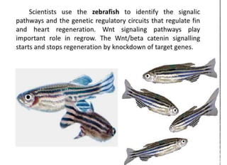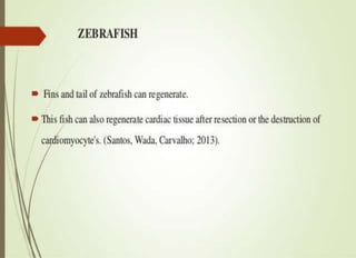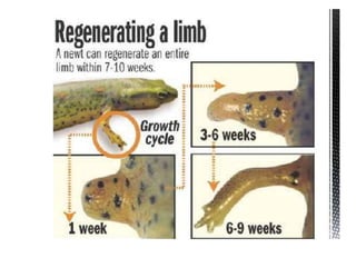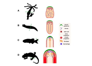 Regeneration is the process by which organisms replace or restore damaged or lost structures. Some organisms like lizards can regenerate their tails if cut off. For some organisms, entire bodies can be regenerated from small tissue fragments. Regeneration in salamanders involves wound healing, blastema formation from undifferentiated cells, redifferentiation of the blastema into limb structures like digits, and growth to the size of a normal limb. Growth factors stimulate wound healing and regeneration by promoting cell mitosis and blood vessel repair.