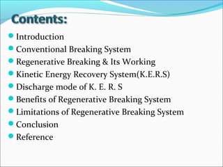 This document discusses regenerative braking systems. It begins with an overview of conventional braking systems and how they waste kinetic energy as heat. It then explains how regenerative braking systems capture this wasted kinetic energy during braking by using the vehicle's electric motor or generator to convert it back into electrical energy for storage in the battery. This recovered energy can then be used to extend the vehicle's driving range. The document covers the key components and working of regenerative braking systems including KERS and their benefits like reduced emissions and increased fuel efficiency. It concludes by noting regenerative braking is not a complete solution on its own due to limitations at low speeds and as a backup in case of failure.