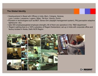 - Regent Lighting is headquartered in Basel, Switzerland with offices globally including in India. It employs around 500 people total with 80 in R&D.