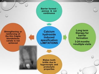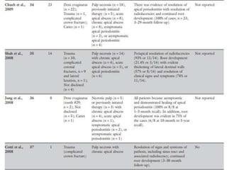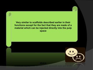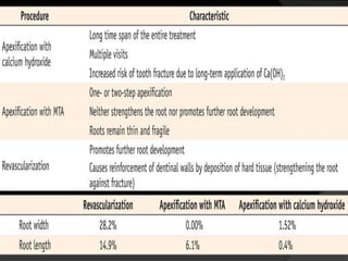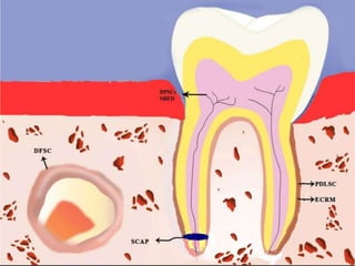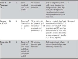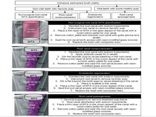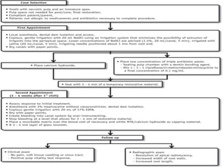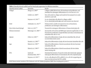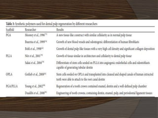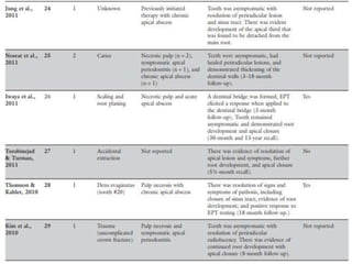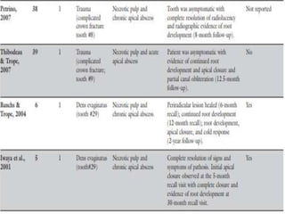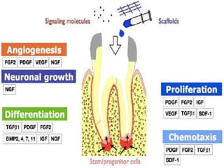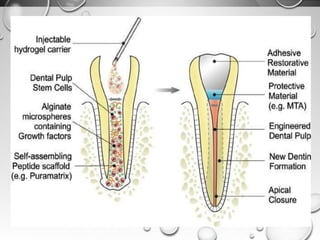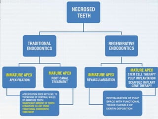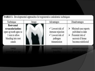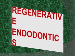 The document discusses regenerative endodontics, which involves biologically based procedures aimed at replacing damaged dental tissues, particularly the pulp-dentin complex. It highlights the importance of stem cells, growth factors, and scaffolds in tissue engineering, along with historical advancements in regenerative techniques. The document also examines the challenges and advantages of using regenerative endodontic therapy compared to traditional root canal treatments.