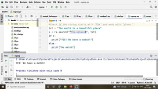 Regular expressions (RegEx) allow users to match patterns in strings using metacharacters and special sequences. The re module provides functions like findall(), search(), split(), sub() to search strings and return matches. Match objects provide properties like span() and string to retrieve match information.