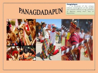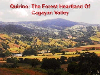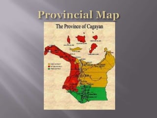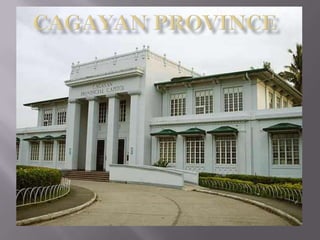 The document provides information about the Cagayan Valley region and the province of Cagayan in the Philippines. It discusses the geography, history, economy, and culture of the area. Specifically, it notes that Cagayan Valley is located in northeastern Luzon and contains fertile farmland and forests. It has been inhabited for over 500,000 years and was an important trading hub before the Spanish arrived in the 16th century. Today, the economy relies on agriculture including tobacco and the Cagayan River plays a key role. The province of Cagayan covers a large area and contains many municipalities, with Tuguegarao City as the capital.