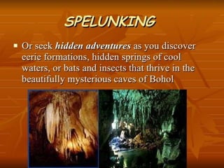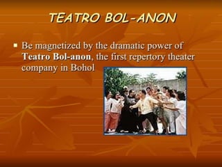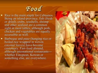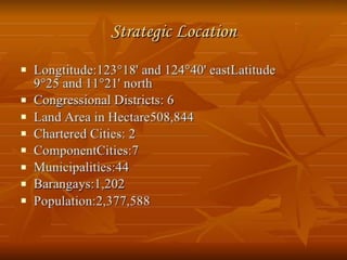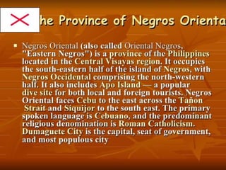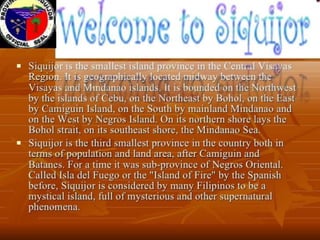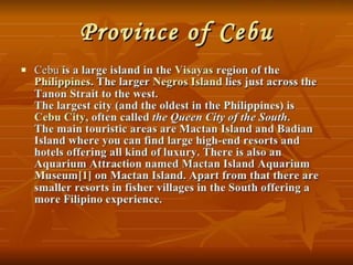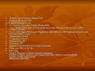 Region 7, located in central Visayas, consists of four provinces - Bohol, Cebu, Negros Oriental, and Siquijor. With a total land area of 15,875 sq km and population of over 6.3 million people, it is the 5th most populous region in the Philippines. The dominant language is Cebuano. Notable festivals include religious processions for Santo Niño and the Bugwas Festival in San Juan honoring St. Augustine of Hippo. The region has several prominent universities including University of San Carlos, Cebu Normal College, and University of San Jose-Recoletos.
