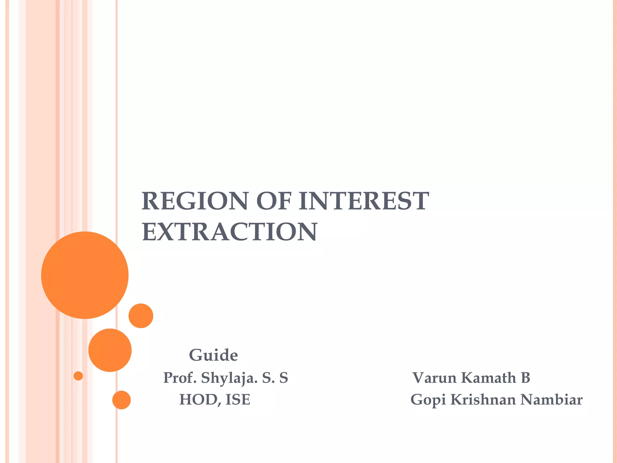 1. The document discusses different techniques for region of interest (ROI) extraction from images, including saliency maps, visual attention maps, the Itti-Koch model, and the Stentiford model.