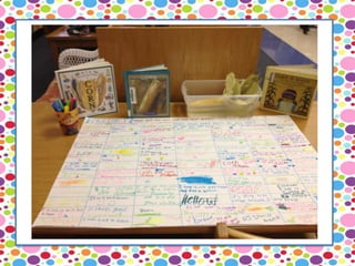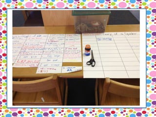 The document outlines various library center activities designed to enhance student engagement and choice through interactive learning. It discusses the setup of simple centers such as puzzles, listening stations, and animal displays, along with tips for managing them effectively. Additionally, it provides suggestions for library displays and themes for book reviews to encourage student participation.