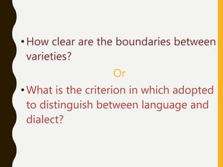 This document discusses models for distinguishing between languages and dialects. It examines the hierarchical family tree model and notes limitations with this approach. Specifically, isoglosses representing different linguistic features do not always align and can intersect, contradicting the assumption in the family tree model that isoglosses should never cross. The document concludes that isoglosses on their own are not sufficient to reliably delimit linguistic varieties, calling into question how to distinguish varieties if not by isoglosses alone.