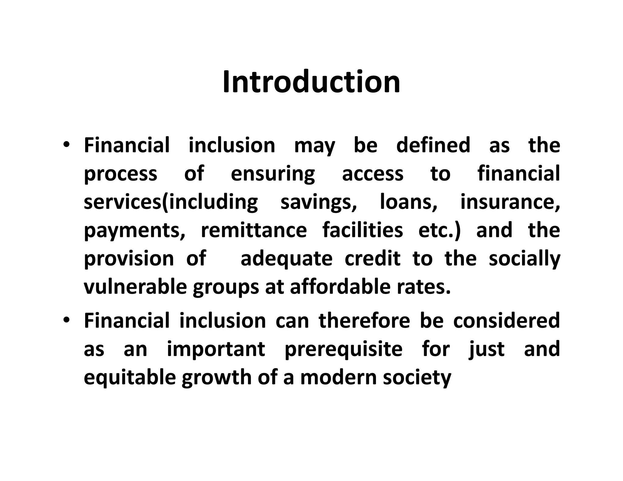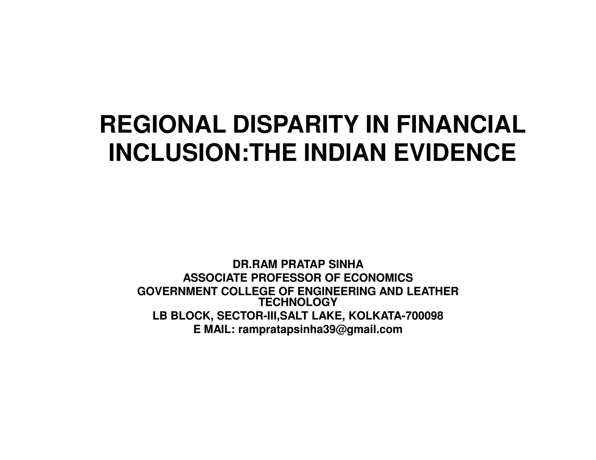 This document analyzes regional disparity in financial inclusion in India using two models. Model I uses a multidimensional index approach to compare states based on deposits, credits, and insurance across regions. The Southern region had the highest index value, while the Eastern region was the lowest. Model II uses a data envelopment analysis approach, finding higher index values for Western and Northern regions compared to the North-Eastern region having the lowest values. Overall, the study finds significant regional variation in financial inclusion across Indian states.