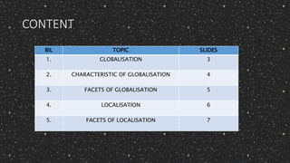 This document discusses globalization and localization. It defines globalization as the increased interconnection among countries in economics, politics, and culture. Key characteristics of globalization include improved technology, the spread of knowledge and information, and the rise of multinational corporations and NGOs. Facets of globalization include the spread of ideas and technologies as well as flows of goods and services. Localization occurs as communities strengthen local traditions in response to globalization and can include political nationalism, religious differences, resistance to economic globalization, and customs that preserve local identities.