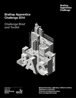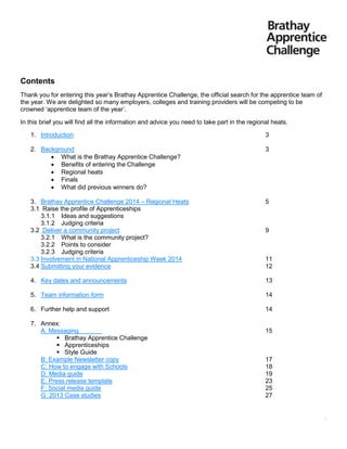 The document provides information for teams participating in the Brathay Apprentice Challenge regional heats. It outlines the requirements and judging criteria for the heats, which involve raising awareness of apprenticeships, completing a community project, and participating in National Apprenticeship Week. Teams are encouraged to promote apprenticeships internally and externally using various media like newsletters, school visits, social media, and traditional media. The toolkit offers guidance and examples to help teams complete the regional heat tasks successfully.