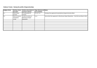This document is an evidence tracker for raising the profile of apprenticeships. It tracks two pieces of evidence: 15 screenshots posted on an intranet to promote apprenticeships, and two articles in an internal company newsletter promoting apprenticeships that appeared in February and March 2014 issues. Page references in a portfolio are provided for each evidence item.