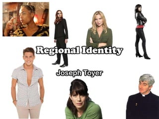 This document discusses regional identities and stereotypes of characters from different parts of the UK, including Scotland, Ireland, Wales, England, the North of England, the South of England, and the South West of England. It describes characteristics like accents, backgrounds, behaviors, fashion, and locations that are commonly associated with or exemplified by each region.