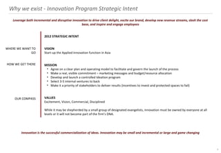 The document outlines a proposed holistic innovation program for a large multinational company, emphasizing the need for a comprehensive operating model to ensure successful commercialization of ideas. It highlights the importance of defining strategic intent, creating a conducive environment for innovation, and fostering a culture that supports innovative behavior throughout the organization. Activities and initiatives are detailed to facilitate ideation, incubation, and transformation of prototypes into market changes while ensuring proper organizational structure and resource allocation.
