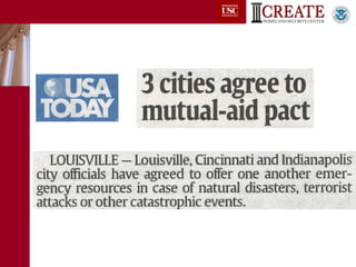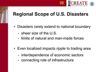 The document discusses regional models and data for analyzing disaster mitigation and resilience, particularly in the context of U.S. disasters that often have localized impacts. It examines the interdependence of economic sectors and presents various models, including input-output and computable general equilibrium, for evaluating resilience at different levels. Resilience is framed as a cost-effective strategy for reducing disaster losses and emphasizes the role of citizens in enhancing resilience.