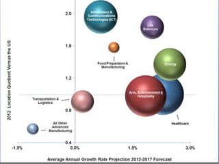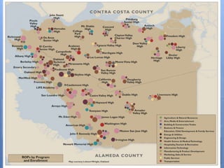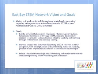 The document outlines the vision and goals of the East Bay STEM Network which aims to connect employers, educators, and other stakeholders in Alameda and Contra Costa counties to improve STEM educational outcomes. The Network has a steering committee of 60 members from diverse sectors and a backbone staff. It takes a cradle-to-career approach through four action groups focusing on early STEM learning, out-of-school STEM programs, STEM professional learning communities for educators, and STEM college and career pathways. The college and career pathways group aims to increase the number of students pursuing STEM degrees and careers by developing articulated pathways from high school to postsecondary programs.