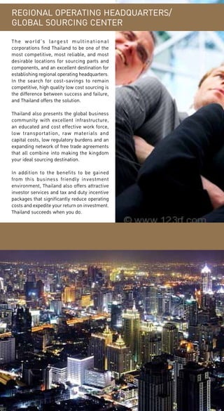 Thailand offers several advantages for companies looking to establish regional operating headquarters (ROHs) or use Thailand as a sourcing center, including: