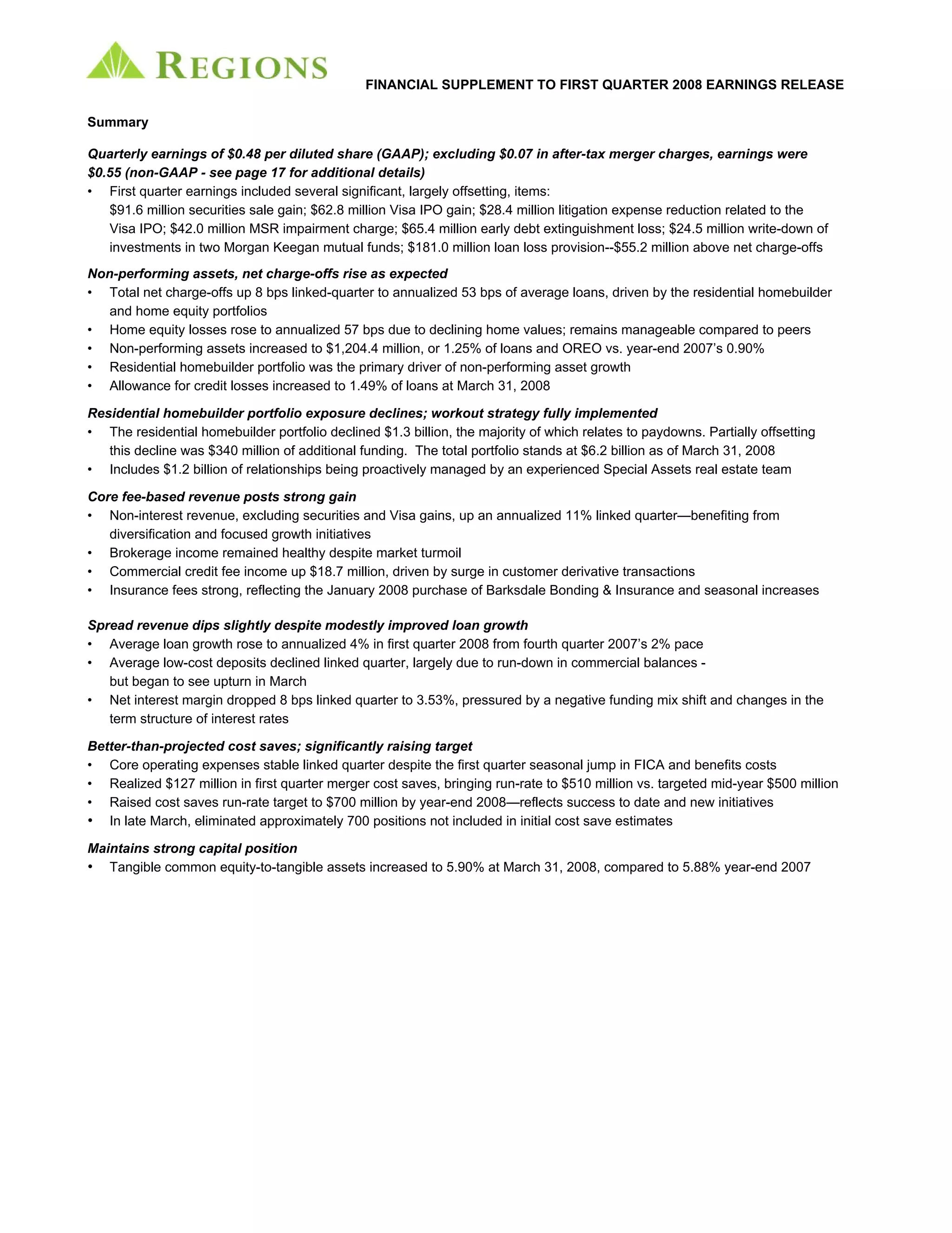 Regions Financial Corporation reported quarterly earnings of $0.48 per share, which included several significant items that largely offset each other. Non-interest income increased 11% driven by diversification initiatives while net interest margin declined due to funding mix shifts. Non-performing assets rose as expected due to the residential homebuilder portfolio, but cost saves targets were raised after realizing $127 million in first quarter merger savings.