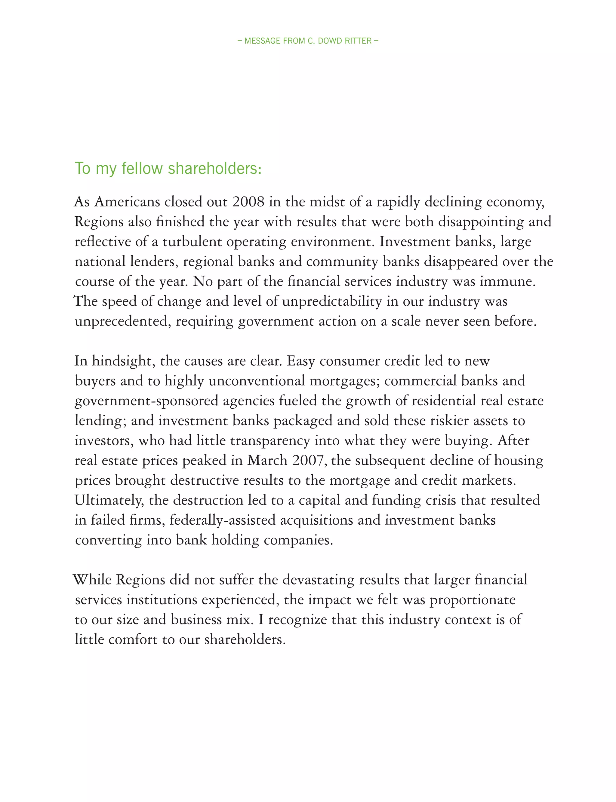 Regions Bank had disappointing financial results in 2008 that reflected the turbulent operating environment caused by the housing crisis and recession. Non-performing assets and credit losses increased compared to 2007 but remained below industry levels due to Regions' prudent underwriting. Regions remains well-capitalized and focused on serving customers, growing deposits, and delivering shareholder value from a position of strength and stability despite the challenging economic conditions.