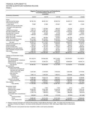 - Regions Financial reported quarterly earnings of $0.63 per share or $0.69 per share excluding merger charges - Key drivers of earnings were fee income growth, strong performance of Morgan Keegan, low credit costs, and faster than expected achievement of merger cost savings - Excellent progress integrating recent mergers, including successful conversion of 633 branches in Alabama and Florida in July - Maintained disciplined balance sheet and capital management with solid loan growth and increased low-cost deposits - Increased non-interest revenue and fee income despite divesting branches, while net interest income declined due to margin compression from the divestitures - Credit costs remained low while strengthening loan loss reserves