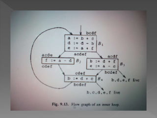 This document discusses various strategies for register allocation and assignment in compiler design. It notes that assigning values to specific registers simplifies compiler design but can result in inefficient register usage. Global register allocation aims to assign frequently used values to registers for the duration of a single block. Usage counts provide an estimate of how many loads/stores could be saved by assigning a value to a register. Graph coloring is presented as a technique where an interference graph is constructed and coloring aims to assign registers efficiently despite interference between values.