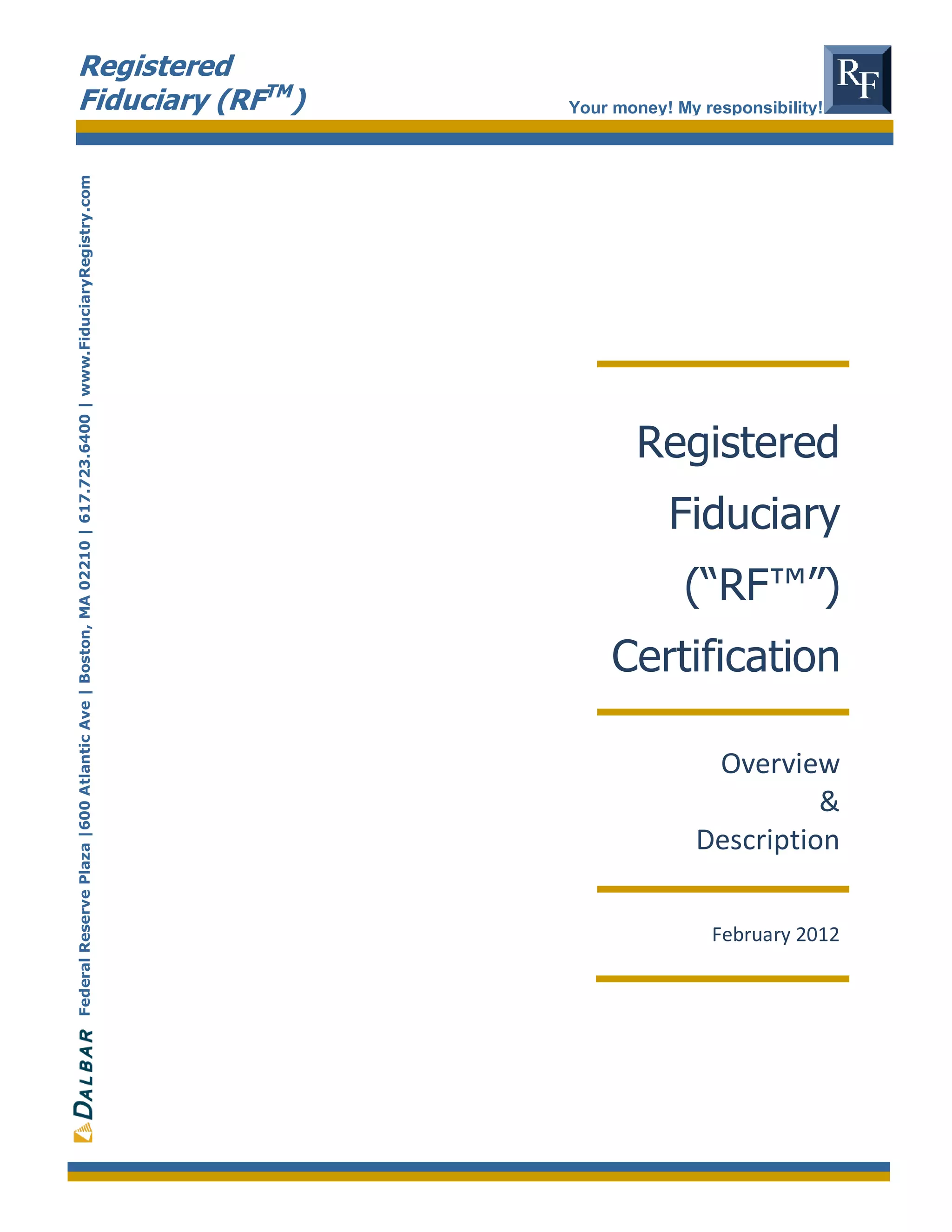 The Registered Fiduciary (RFTM) certification identifies financial professionals who commit to acting as fiduciaries, ensuring compliance with current regulatory requirements and providing clients with validated fiduciary standards. This certification is vital in a changing regulatory landscape and is distinguished by its rigorous training, background checks, and a commitment to continued education. RFTM designees are expected to maintain a high level of competency, adapt to new regulations, and demonstrate a fiduciary duty to their clients.