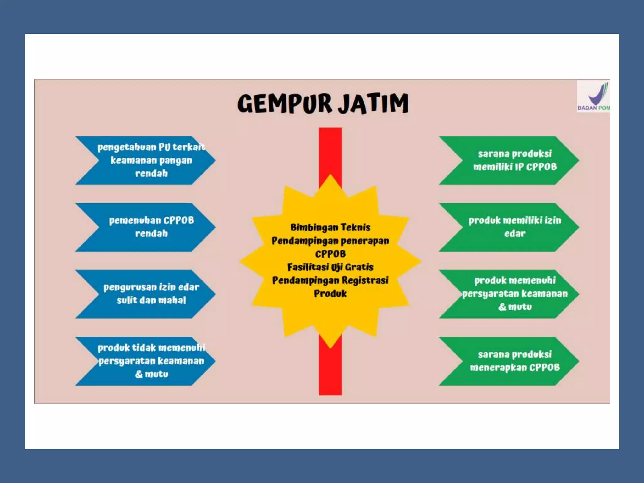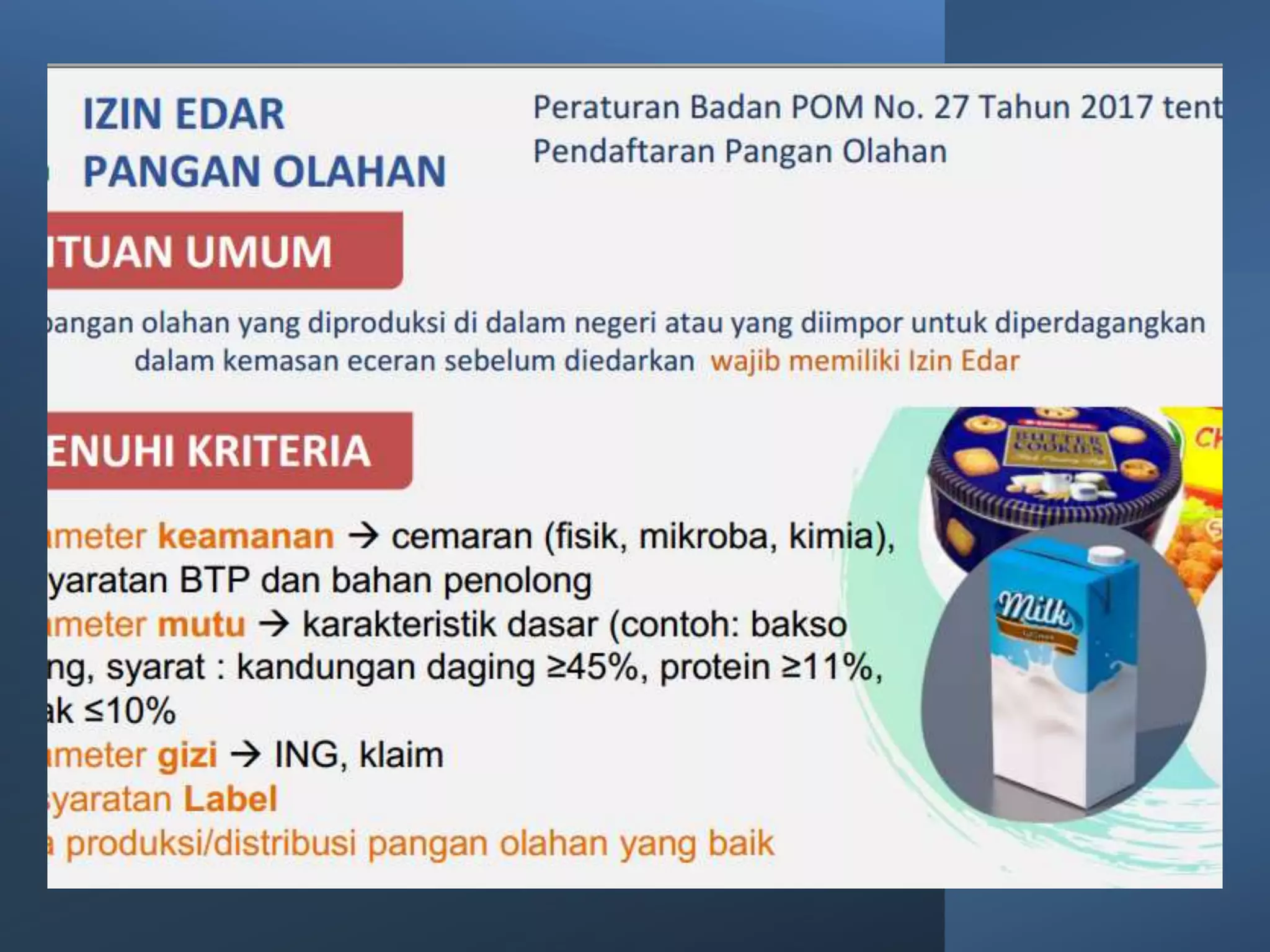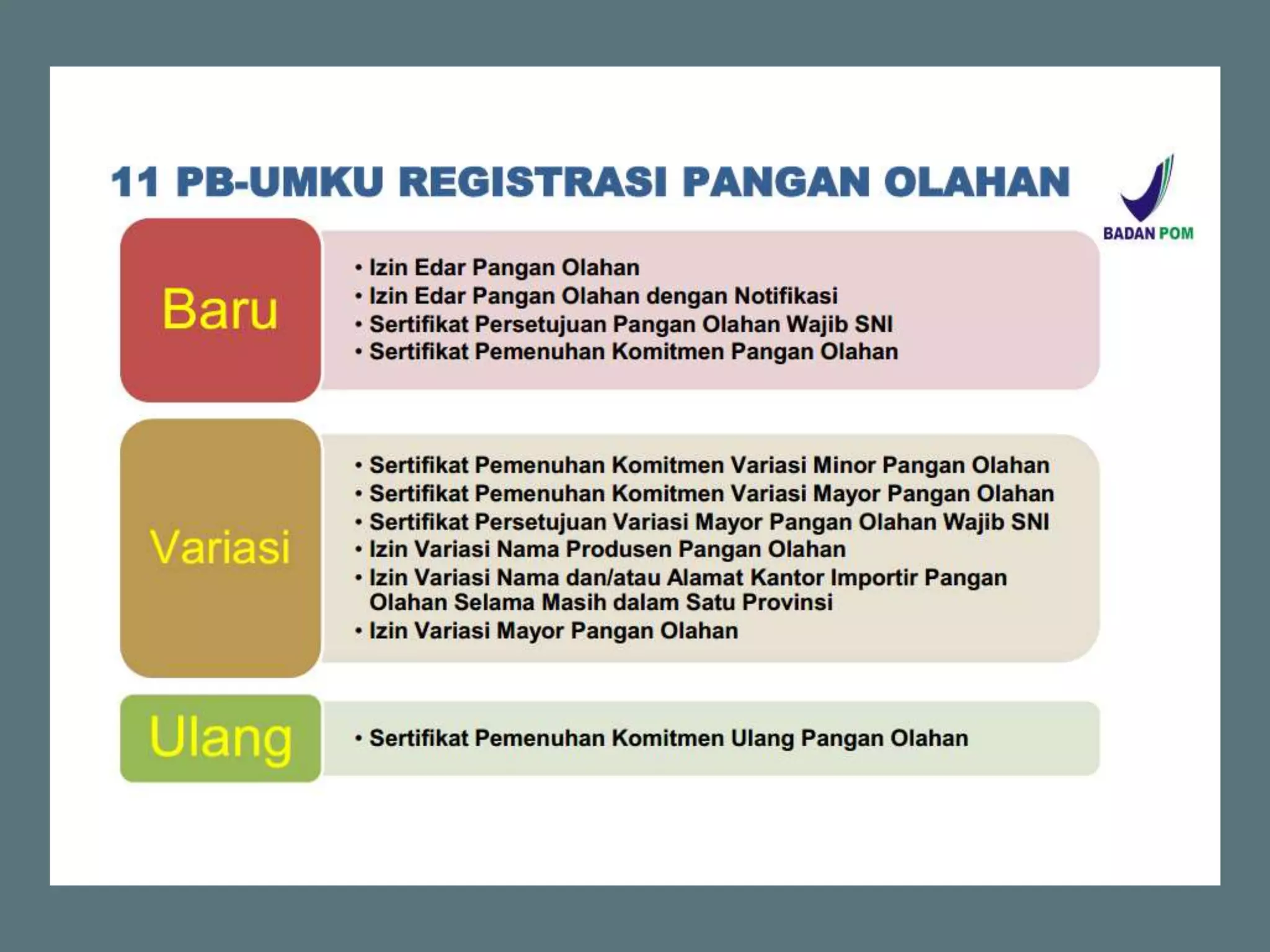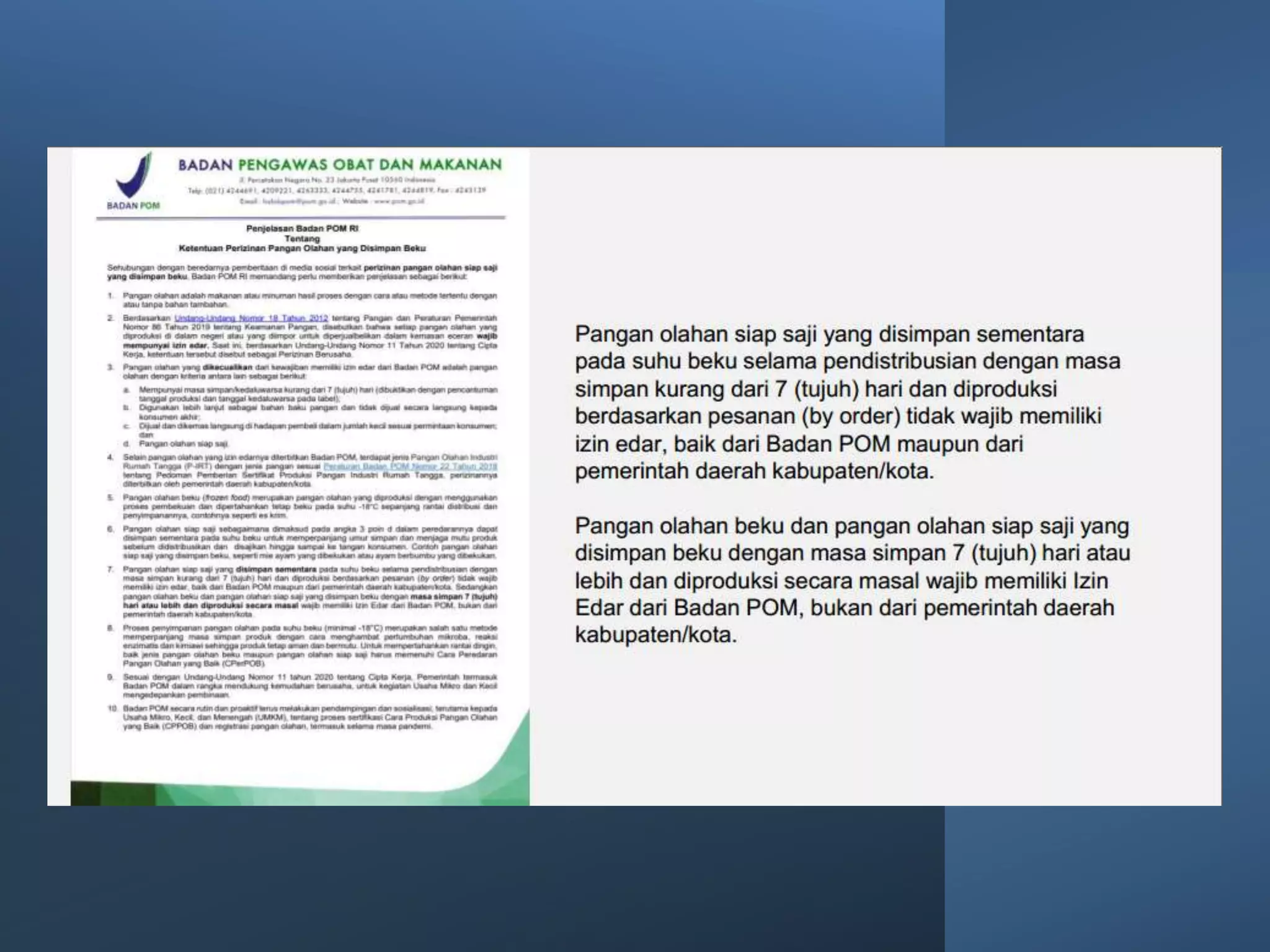 Dokumen ini membahas perizinan pangan olahan oleh Balai Besar POM di Surabaya, mencakup persyaratan keamanan, mutu, dan label pangan olahan. Pelaku usaha diharuskan memenuhi komitmen dan mengikuti pedoman serta peraturan di bidang pangan. Selain itu, terdapat pendaftaran pendampingan UMKM untuk tahun 2023 yang meliputi berbagai biaya dan output terkait produk pangan.