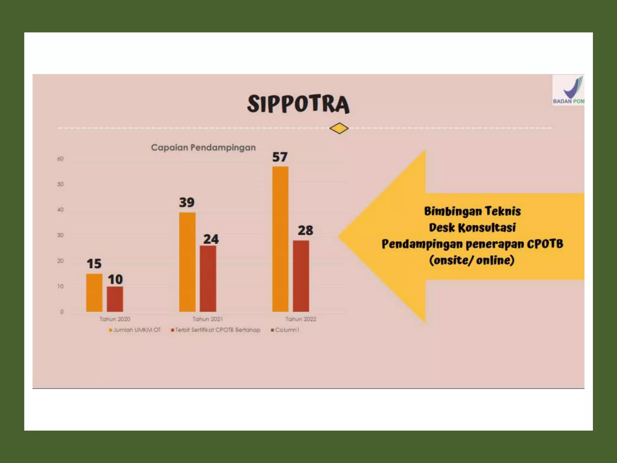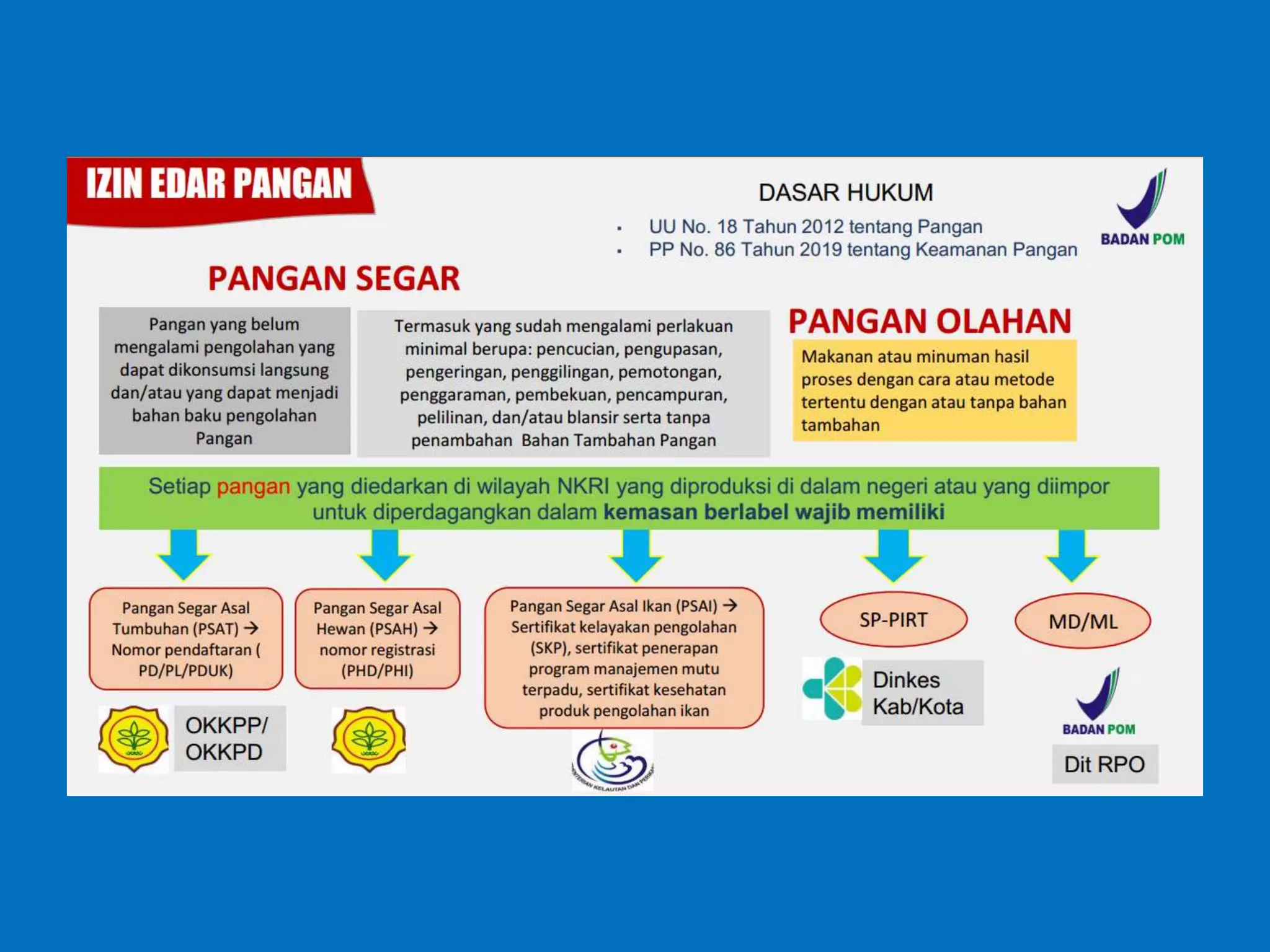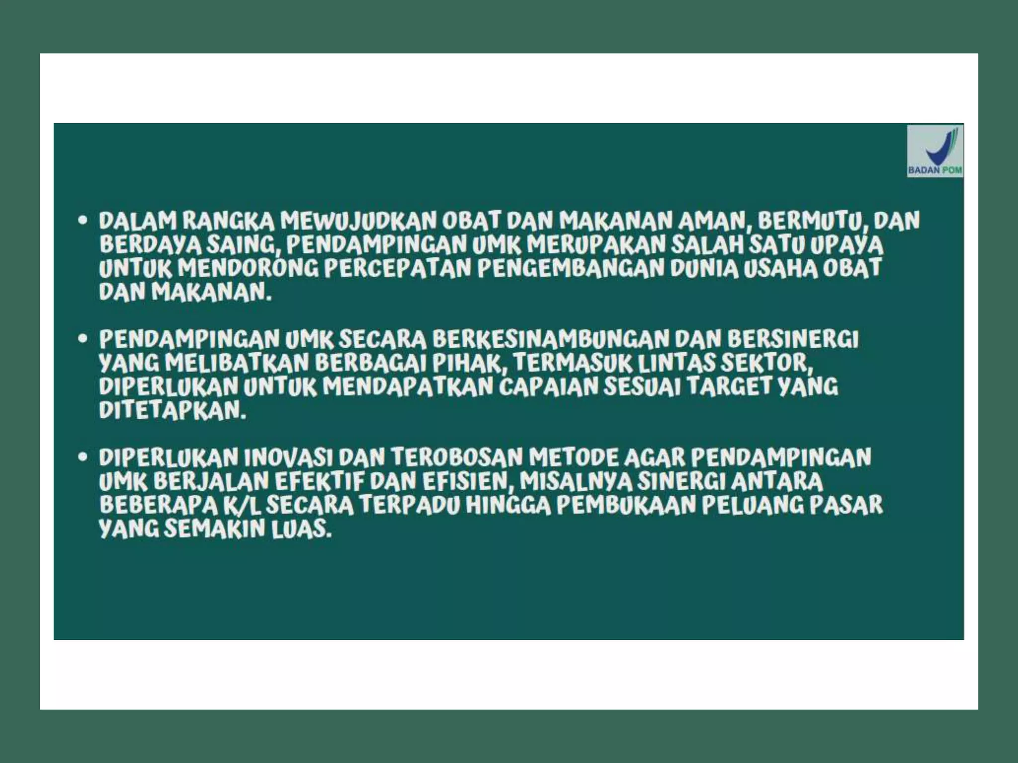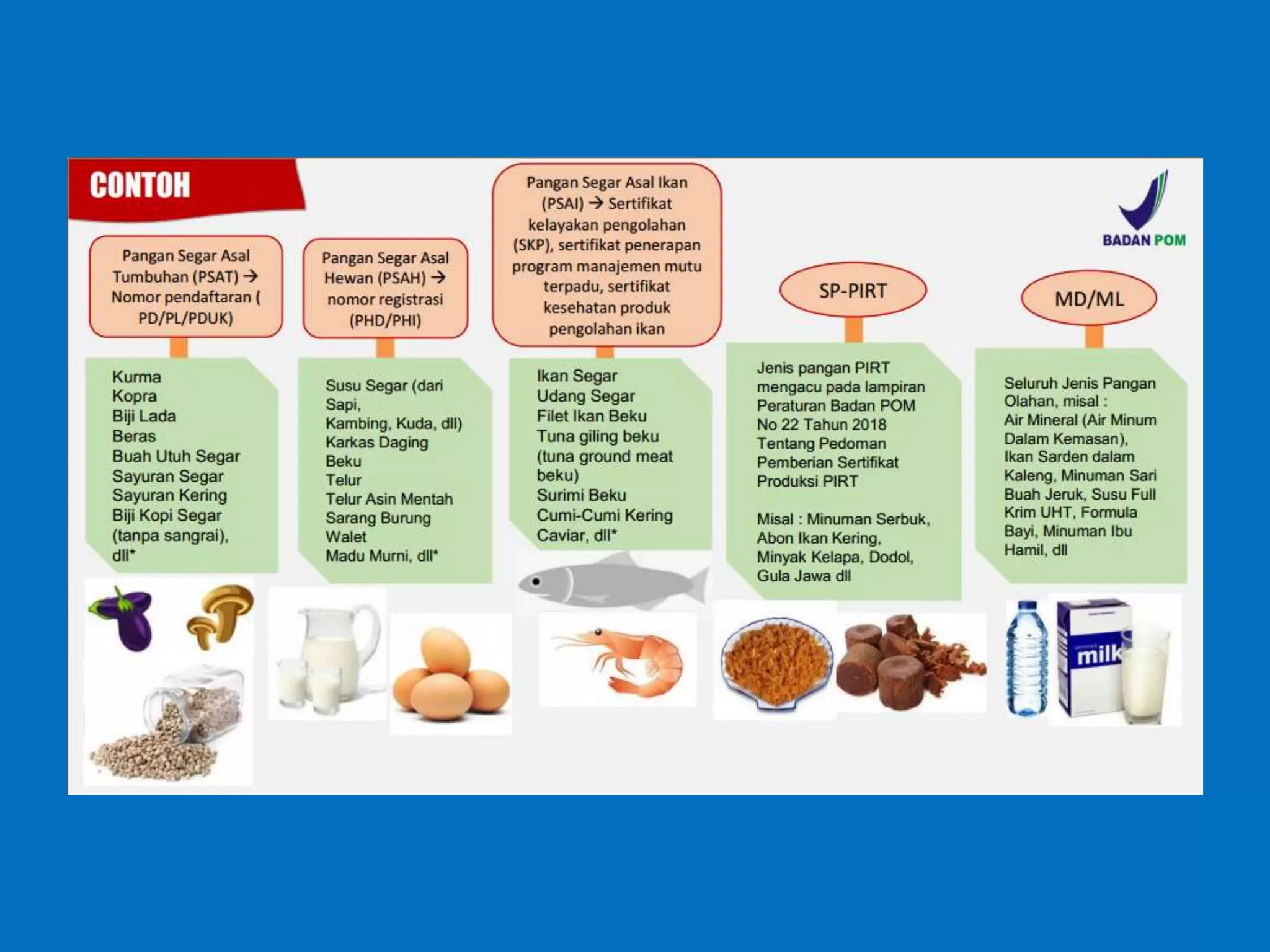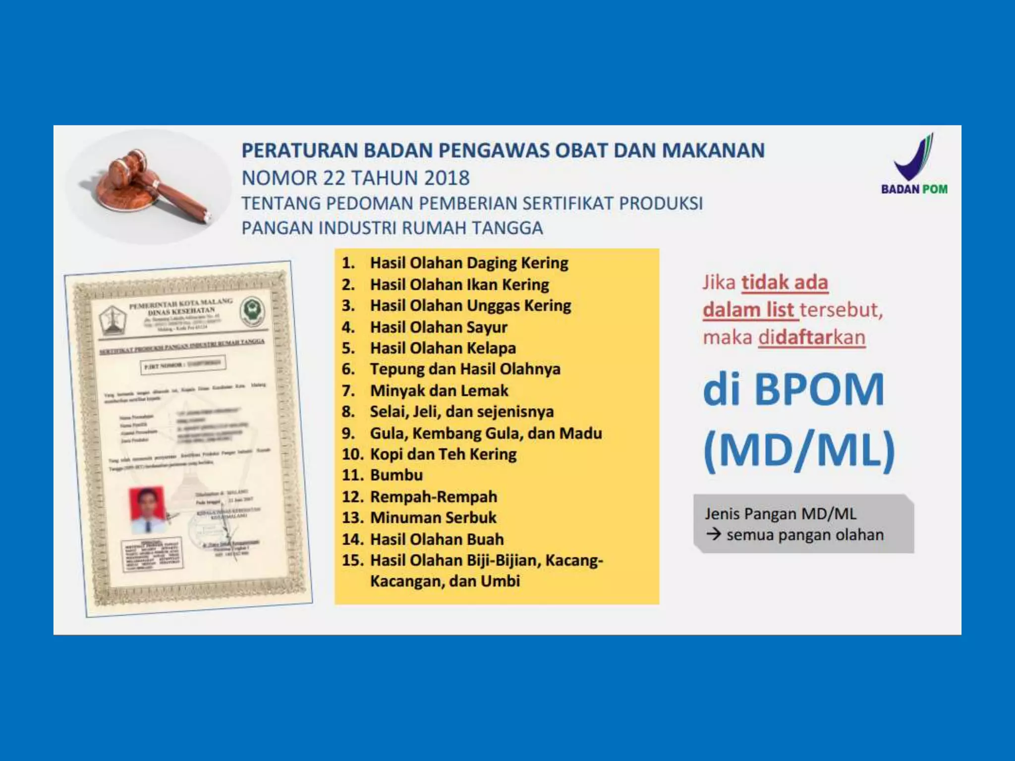 Dokumen ini membahas perizinan pangan olahan oleh Balai Besar POM di Surabaya, mencakup persyaratan keamanan, mutu, dan label pangan olahan. Pelaku usaha diharuskan memenuhi komitmen dan mengikuti pedoman serta peraturan di bidang pangan. Selain itu, terdapat pendaftaran pendampingan UMKM untuk tahun 2023 yang meliputi berbagai biaya dan output terkait produk pangan.