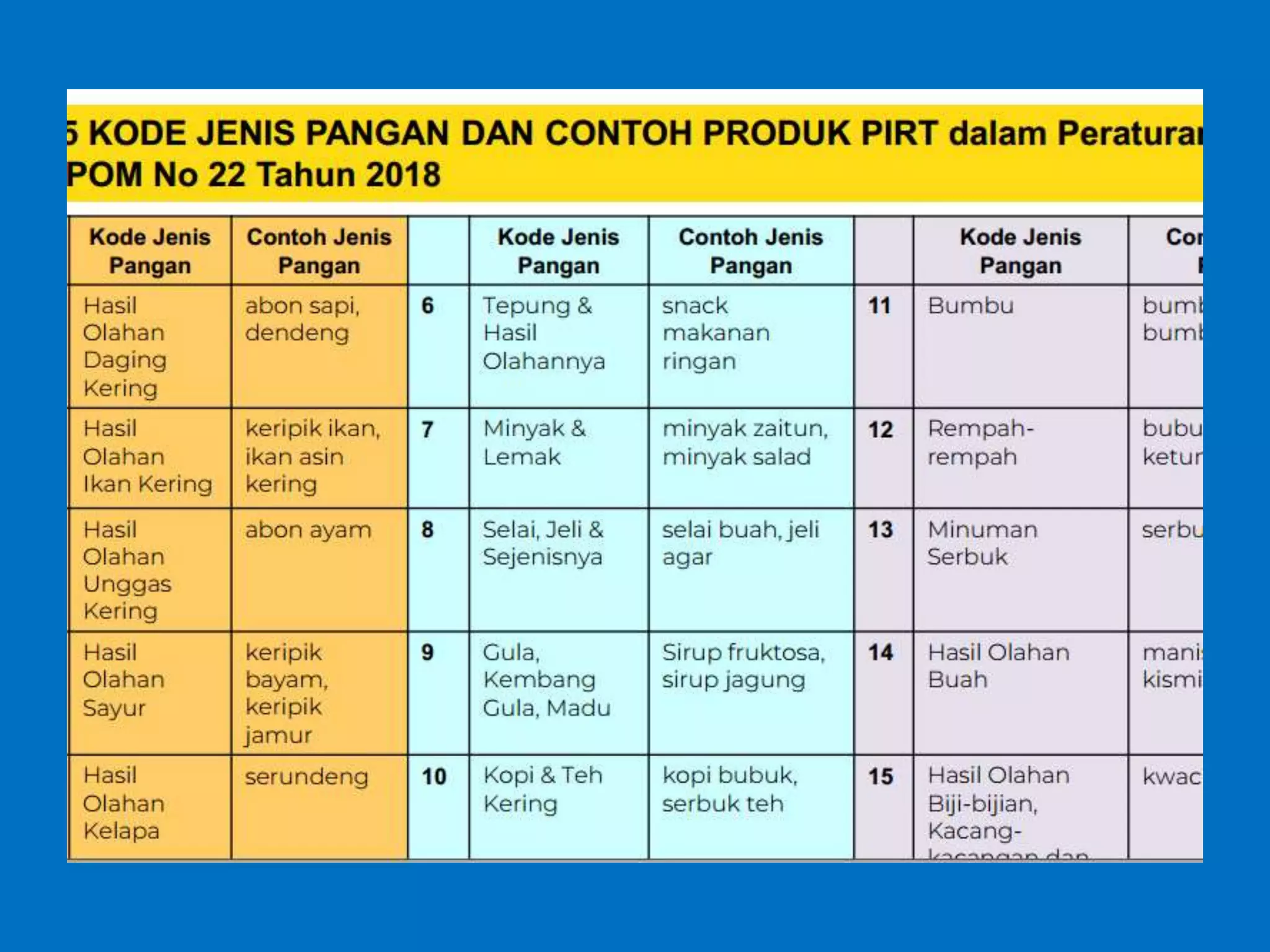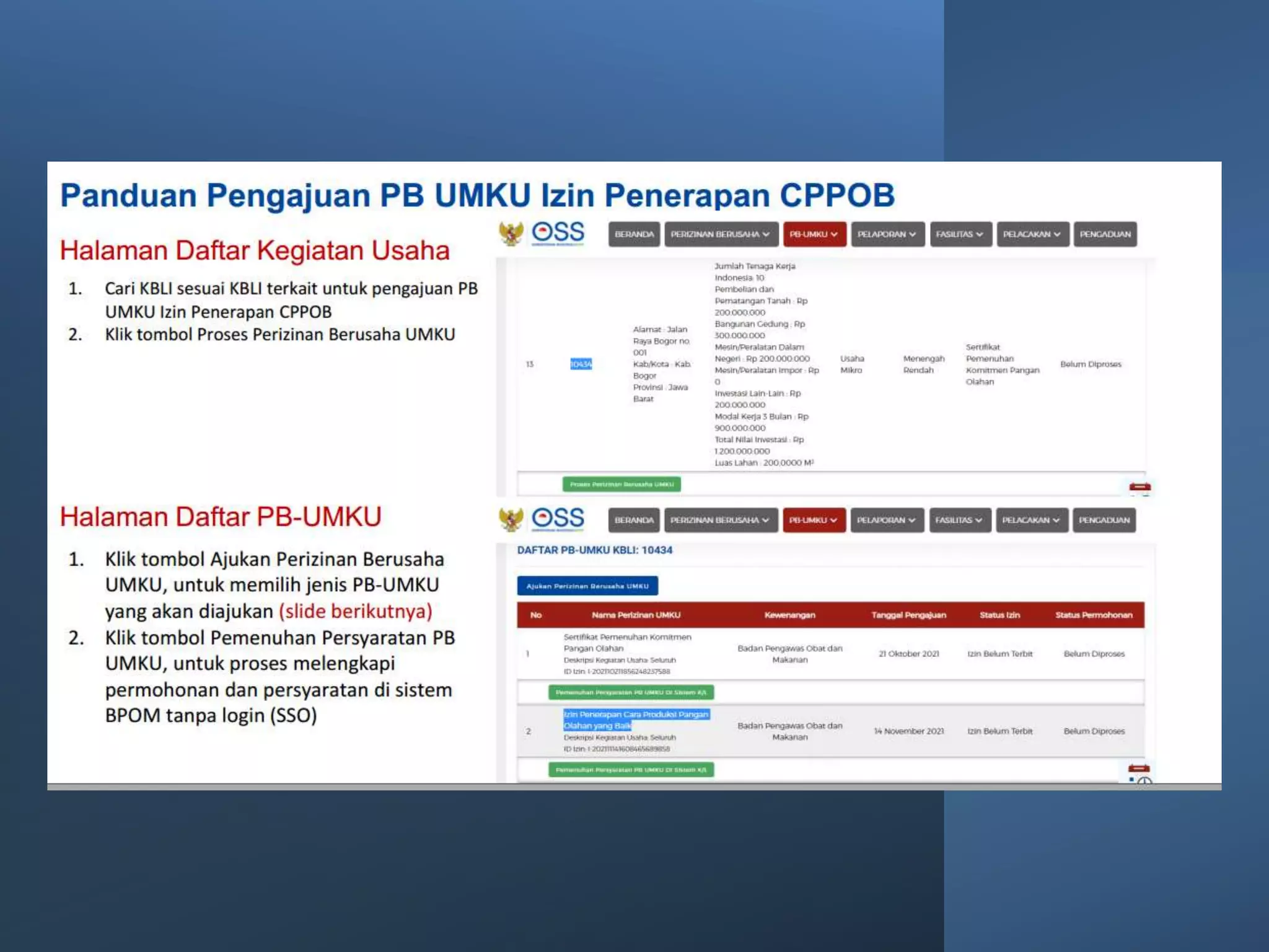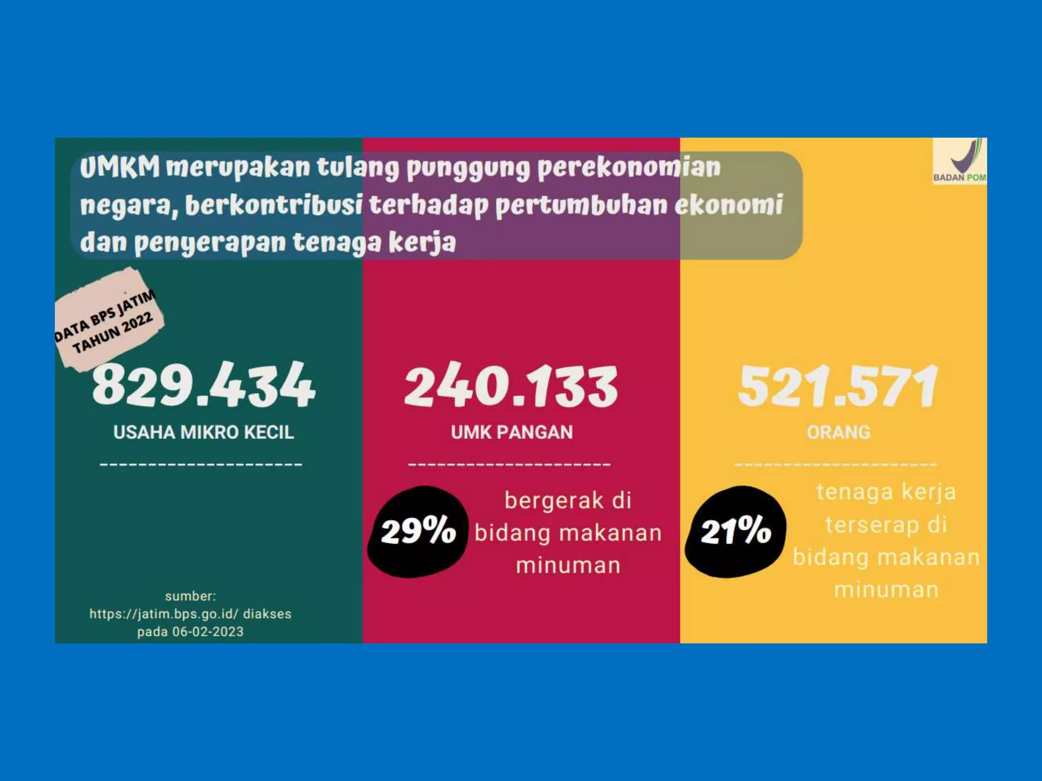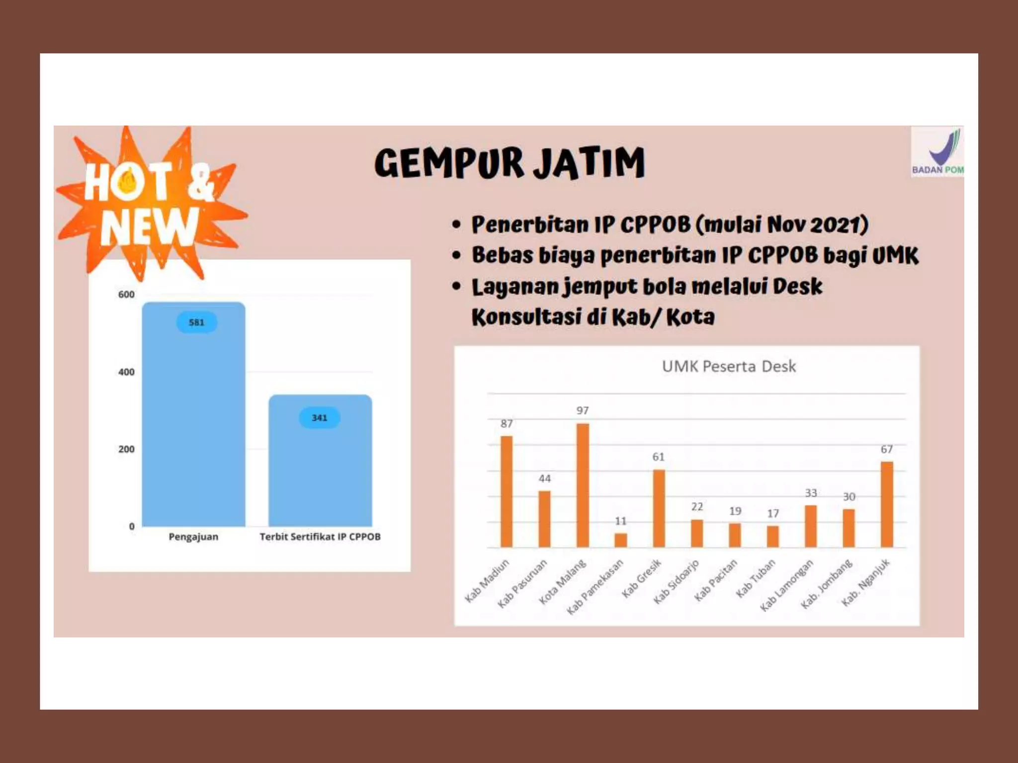 Dokumen ini membahas perizinan pangan olahan oleh Balai Besar POM di Surabaya, mencakup persyaratan keamanan, mutu, dan label pangan olahan. Pelaku usaha diharuskan memenuhi komitmen dan mengikuti pedoman serta peraturan di bidang pangan. Selain itu, terdapat pendaftaran pendampingan UMKM untuk tahun 2023 yang meliputi berbagai biaya dan output terkait produk pangan.