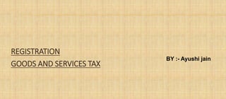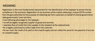 Registration under the Goods and Services Tax (GST) involves obtaining a unique GST identification number (GSTIN) from tax authorities. This allows businesses to legally collect tax from customers, claim input tax credits, and seamlessly transfer credits nationally. Section 22 requires registration for businesses with aggregate annual turnover over Rs. 20 lakh, or Rs. 10 lakh for certain states. Exemptions apply for agriculture, low-turnover businesses, and those exclusively providing exempt supplies. Section 24 mandates registration for interstate suppliers and other special cases regardless of turnover. The registration procedure involves verification, application filing, examination, and issuance of a certificate including the GSTIN and effective date.