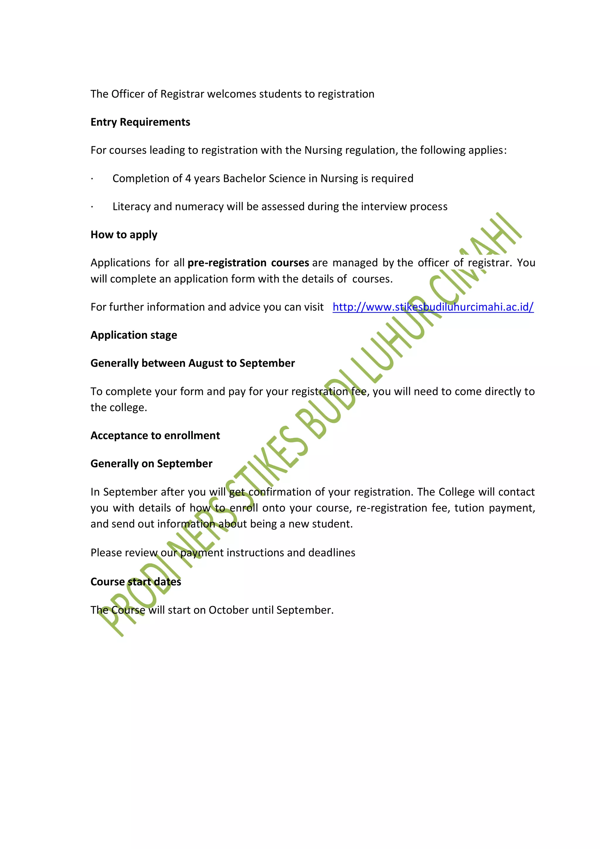 The document outlines the registration process for nursing courses, including entry requirements of a Bachelor of Science in Nursing degree and literacy and numeracy assessment, how to apply by completing an application form between August and September and paying registration fees in person, acceptance and enrollment occurring in September with details on payments and being a new student, course start dates from October to September.