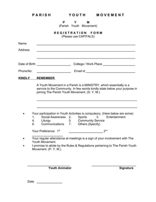 This document contains a registration form for a Parish Youth Movement. It requests the registrant's name, address, date of birth, college/workplace, phone number, and email. It asks the registrant to state in a few words their purpose for joining the youth ministry. It lists activities like social awareness, sports, entertainment, liturgy, and community service. The registrant must select their top two preferences and promise to abide by the movement's rules and regulations. The form is signed by a youth animator.