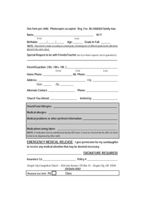 This 3 sentence summary provides the key details from the VBS registration form document: The document is a registration form for a church's Vacation Bible School that collects information such as the child's name, birthdate, grade, parent/guardian contact details, medical information, and an emergency medical release signature in order to register the child for VBS classes. The form notes that photocopies are accepted and there is a $8 per child or $24 family maximum registration fee.