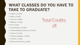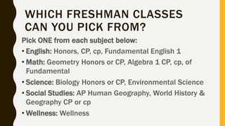 This document provides information about class requirements for graduation and the freshman course registration process. Students must take a minimum of 4 credits each of English, math, and science, as well as credits in social studies, wellness, PE, content reading, finance, foreign language, and fine arts. For freshman year course selection, students pick one class each from options in English, math, science, and social studies, and two electives from choices like art, band, computer applications, and foreign languages. The registration deadline is February 14th, and changes can be made between March 6th-14th. Parents can get help through the school website, by contacting a guidance counselor, or attending informational events.