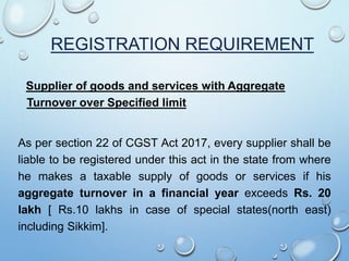 Registration is required under GST for any supplier of goods or services whose aggregate turnover exceeds Rs. 20 lakh. Persons registered under earlier laws will be migrated to GST. Exemptions from registration include agriculturists and those exclusively engaged in exempt supplies. Additional categories requiring compulsory registration include inter-state suppliers and e-commerce operators. Registration involves declaring PAN and other details to obtain a temporary reference number, applying online with documents, and receiving a GSTIN. Amendments and cancellations to registrations are also conducted online. Non-resident taxable persons can obtain temporary registration by submitting passport details.