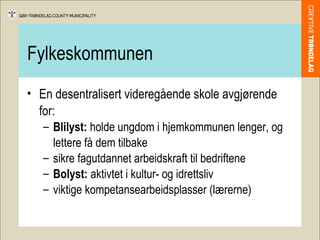 Fylkeskommunen En desentralisertvideregående skole avgjørende for: Blilyst: holde ungdom i hjemkommunen lenger, og lettere få dem tilbake sikre fagutdannet arbeidskraft til bedriftene Bolyst: aktivtet i kultur- og idrettsliv viktige kompetansearbeidsplasser (lærerne)