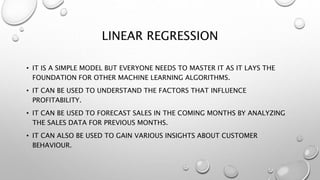 The document discusses linear regression, which is a simple machine learning algorithm that lays the foundation for other algorithms. It finds the relationship between one or more independent variables and a continuous dependent variable. The objective is to find the "best fit line" that minimizes the residual sum of squares between predicted and actual values. Gradient descent is used as the optimization algorithm to iteratively adjust parameters and reduce the cost function until convergence is reached. Root mean squared error and R2 score are common metrics used to evaluate model performance.