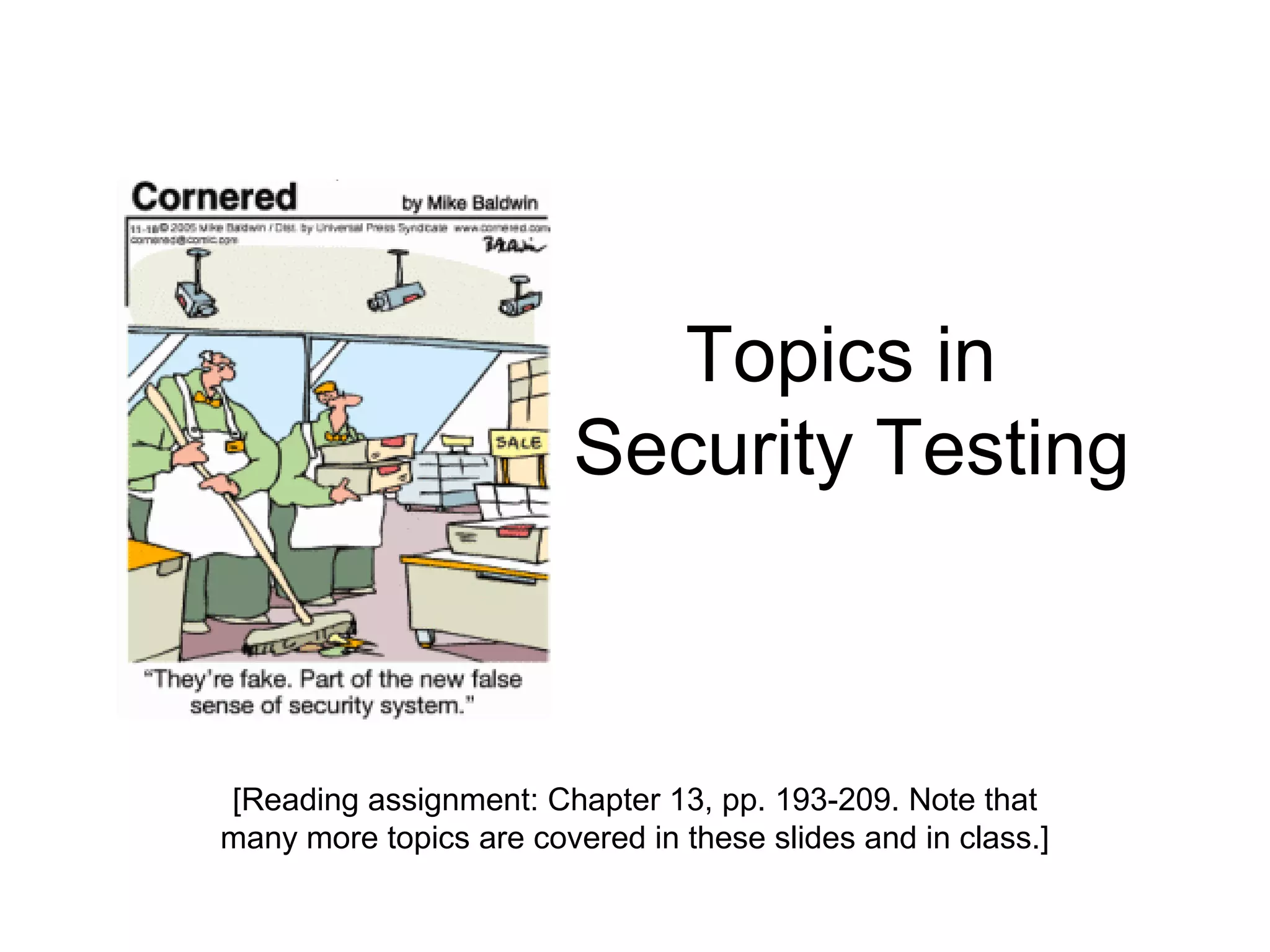 The document discusses various topics in computer security testing including the goals of security, common security mechanisms, approaches to validating software security, security architecture, threat modeling, and types of malware such as viruses, worms, trojan horses, backdoors, and polymorphic viruses. It provides examples and explanations of how these security topics work.