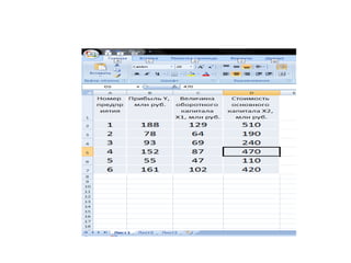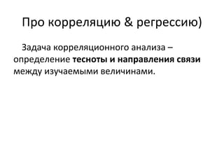Документ описывает регрессионный анализ, включая его теорию и практические аспекты, такие как корреляция и регрессия. Обсуждаются этапы анализа, формы уравнений регрессии, методы прогнозирования и критерии оценки значимости результатов, а также применение Microsoft Excel для выполнения анализа. Основное внимание уделяется интерпретации коэффициентов, определению степени зависимости и проверке адекватности модели.