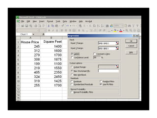 - An example uses home size and price data from 10 houses to generate a linear regression equation predicting that price increases by around $110 for each additional square foot. This model explains 58% of the variation in home prices.
