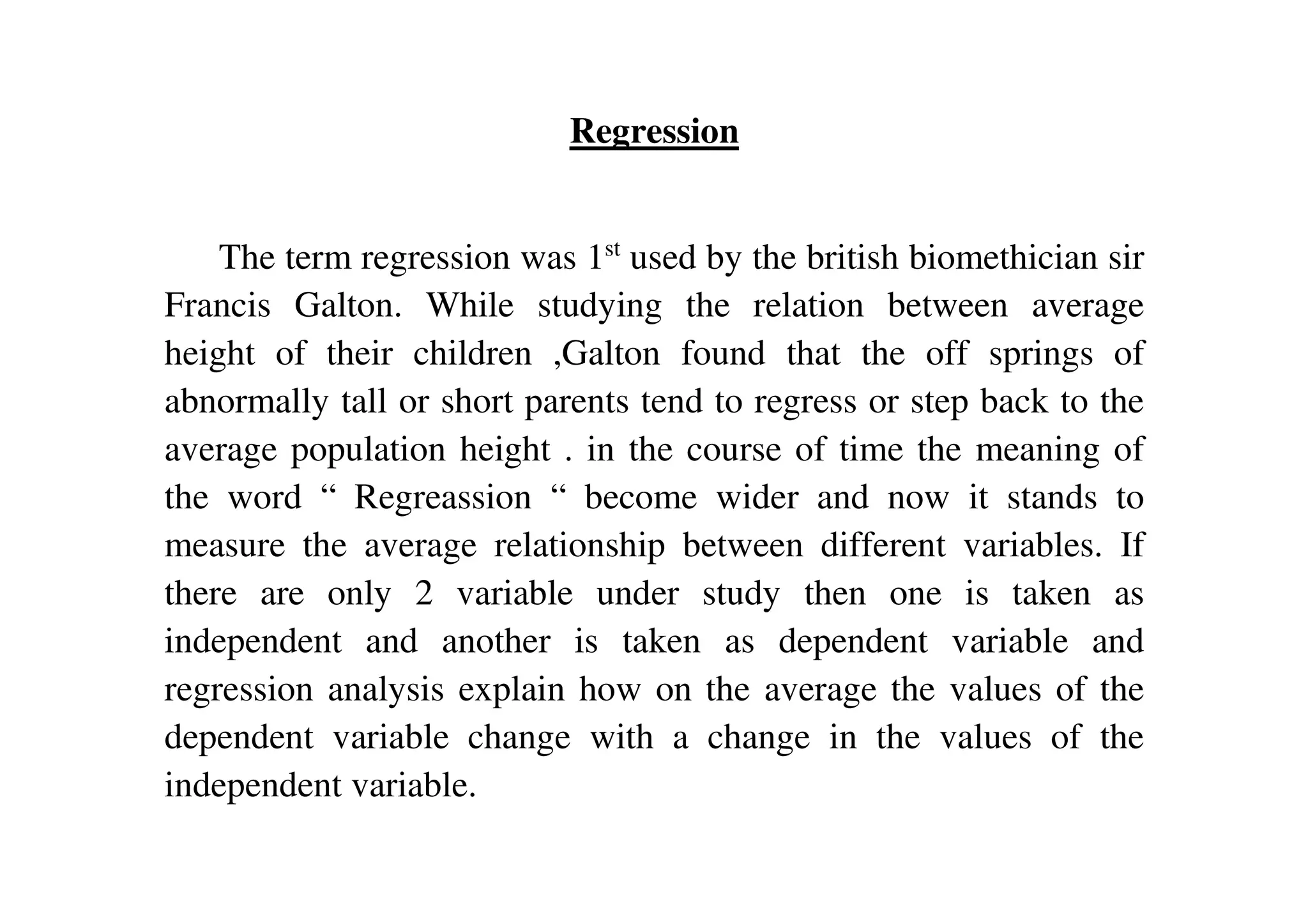 The document explains the concept of regression, starting from its origin with Sir Francis Galton, who identified the relationship between parents' height and their children's height. It discusses linear and curvilinear regression along with the methods to calculate regression lines and correlation coefficients using equations derived from the principle of least squares. Additionally, it provides examples illustrating how to calculate regression lines and make predictions based on given data.