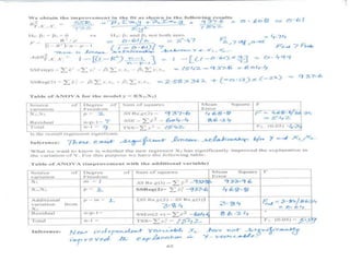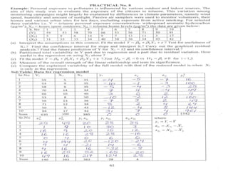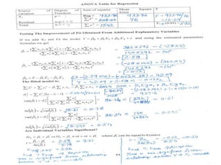 This document discusses regression analysis techniques. Regression analysis is used to model the relationship between a dependent variable (Y) and one or more independent variables (X1, X2, etc). Simple linear regression involves one independent variable, while multiple linear regression involves two or more independent variables. The key assumptions of linear regression are outlined. Methods for estimating regression coefficients using least squares and testing the significance of regression coefficients and the overall regression model are also described. An example application involving modeling personal pollutant exposure (Y) based on hours outdoors (X1) and home pollutant levels (X2) is provided.