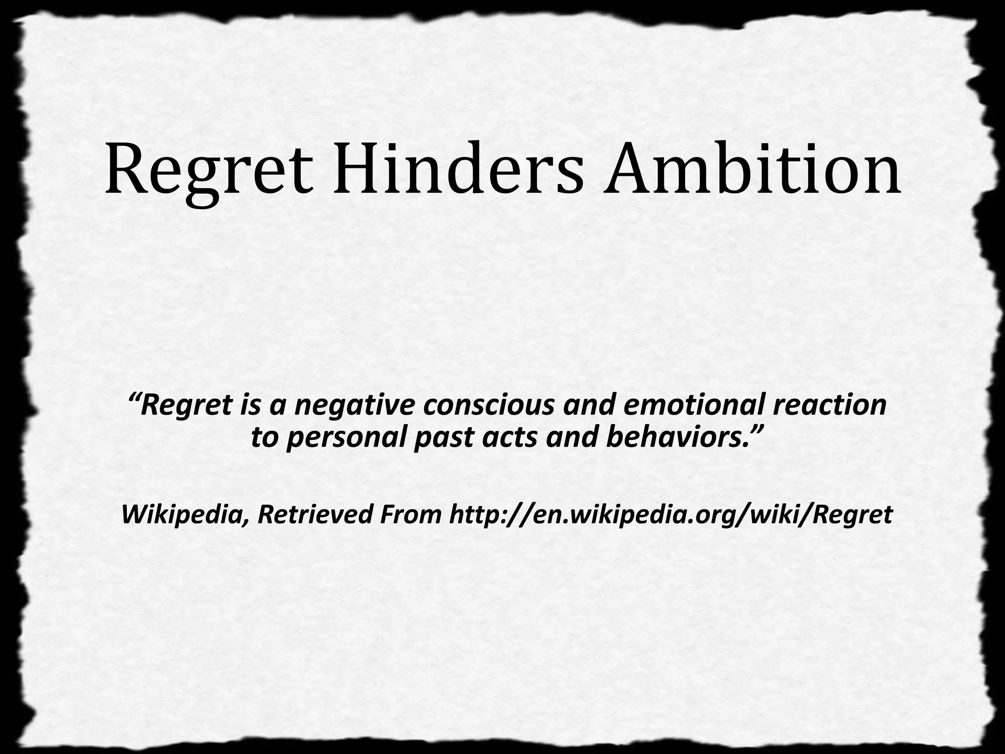 This document discusses how regret can hinder ambition and discusses ways to overcome regret. It defines regret as a negative reaction to past acts and behaviors. It suggests that people often try to hide from or avoid problems caused by mistakes instead of making amends. The document advises readers to admit mistakes, apologize, and not let fear control their lives. It encourages letting go of regret, accepting responsibility for mistakes, and living life to the fullest each day.
