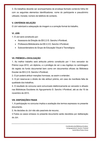 Este documento anuncia um concurso para criar um logótipo para a Biblioteca Escolar D. Sancho I-Pontével. O concurso está aberto a todos e os trabalhos devem ser entregues até 31 de outubro de 2013. O melhor trabalho receberá um prémio de um livro e terá seu logótipo usado nos documentos oficiais da biblioteca.